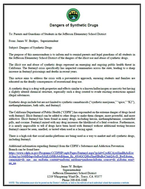 NOTICE: DANGERS OF SYNTHETIC DRUGS